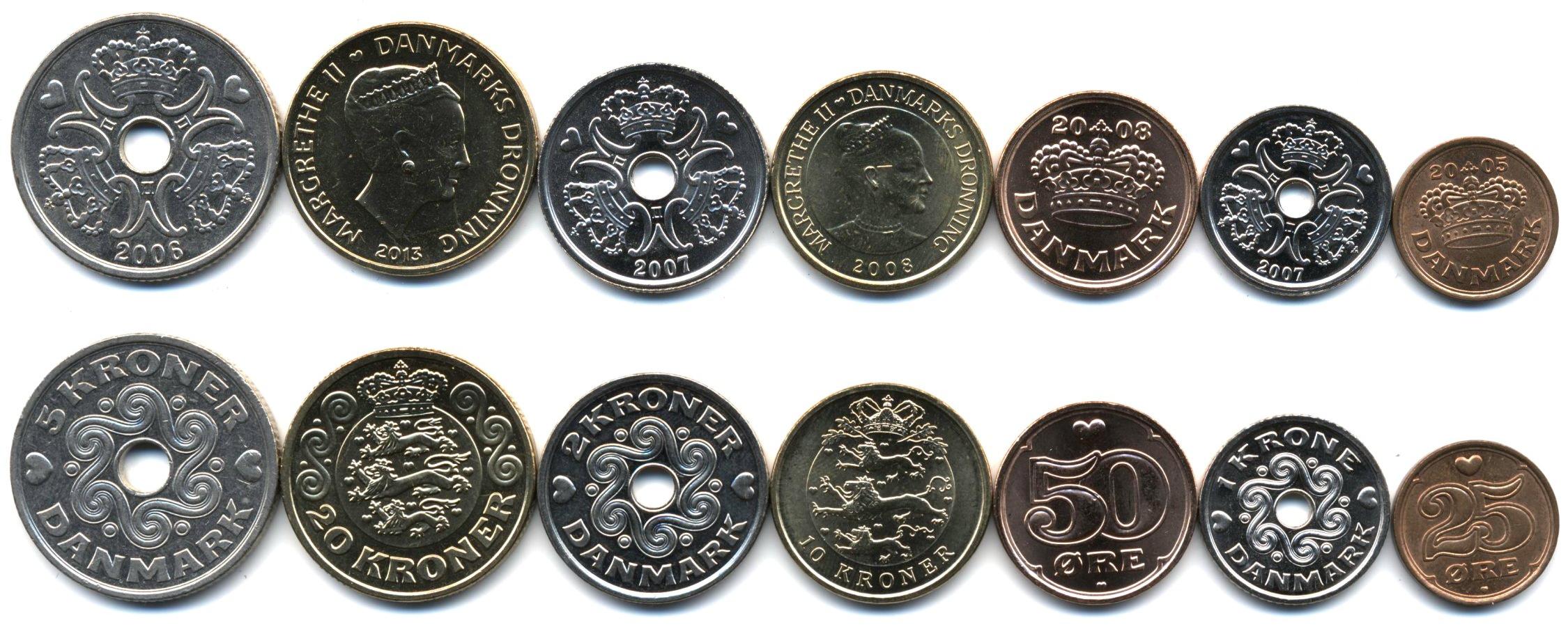Набор из 7 монет: 25(близко к а/ц) и 50 эйр, 1, 2, 5(близко к а/ц), 10 и 20 крон. Монета 25 эйре выведена из обращения 2005-...