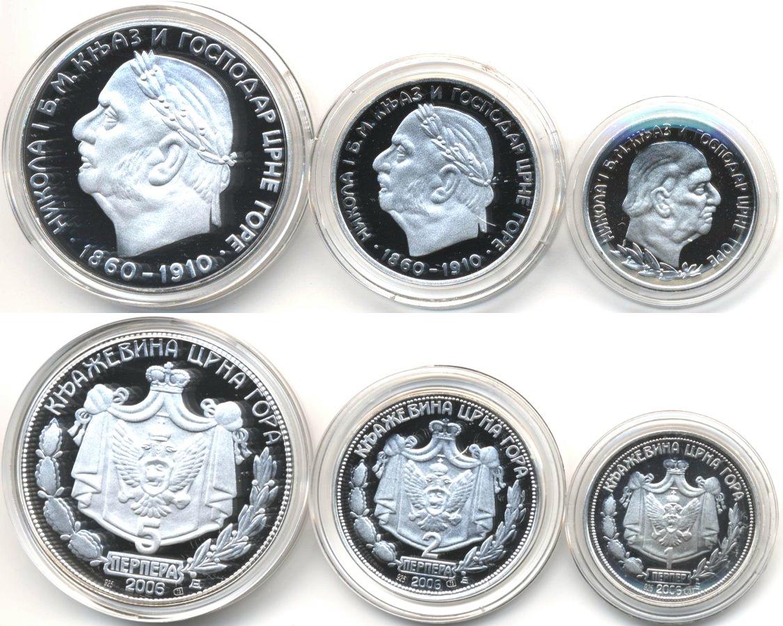 Набор из 3 монет: 1, 2 и 5 перпера. Николай I. Княжество. Пруф. Официальный новодел ЦБ Черногории. Е-1761