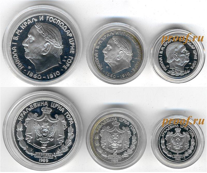 Набор из 3 монет: 1, 2 и 5 перпера. Николай I. Королевство. Пруф. Официальный новодел ЦБ Черногории. Редкость.Е-1025