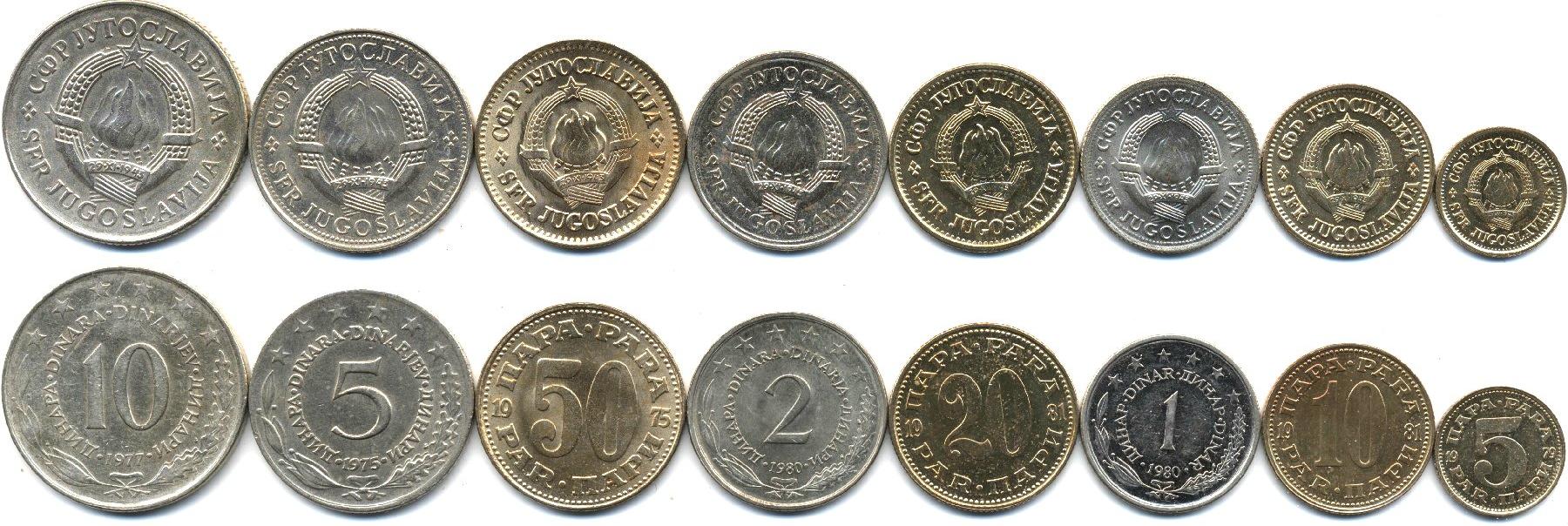 Набор из 8 монет: 5, 10, 20, 50 пара, 1, 2, 5, 10 динаров. XF-AUNC 1974-1981