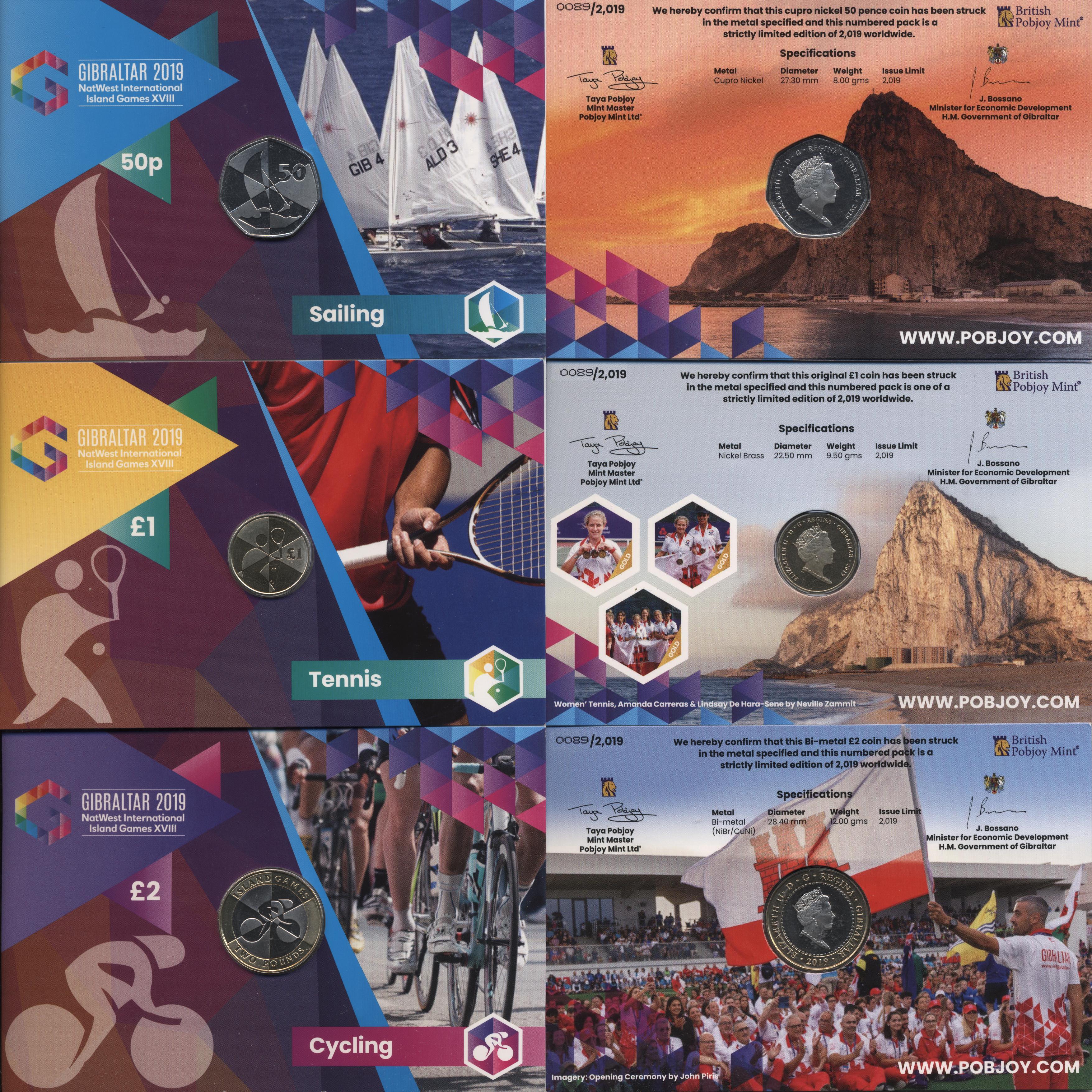 Набор из 3 монет: 50 пенсов, 1 и 2 фунта. XVIII Островные игры. Каждая монета в отдельном блистере