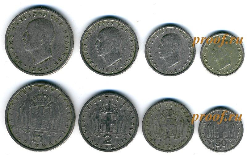 Набор из 4 монет: 50 лепта, 1, 2 и 5 драхм. Павел VF. 1954-1970