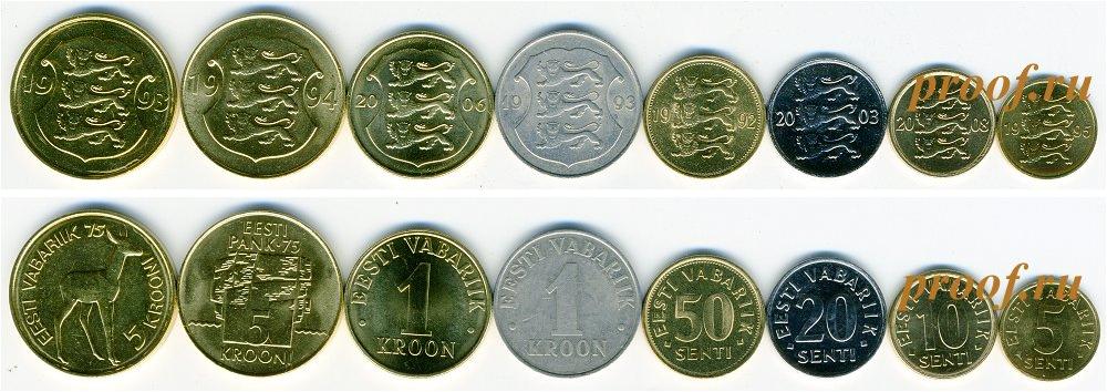 Набор из 8 монет: 5, 10, 20 и 50 центов, 1, 1 и 5, 5(75 лет банку) крон с 1992 по 2006 год