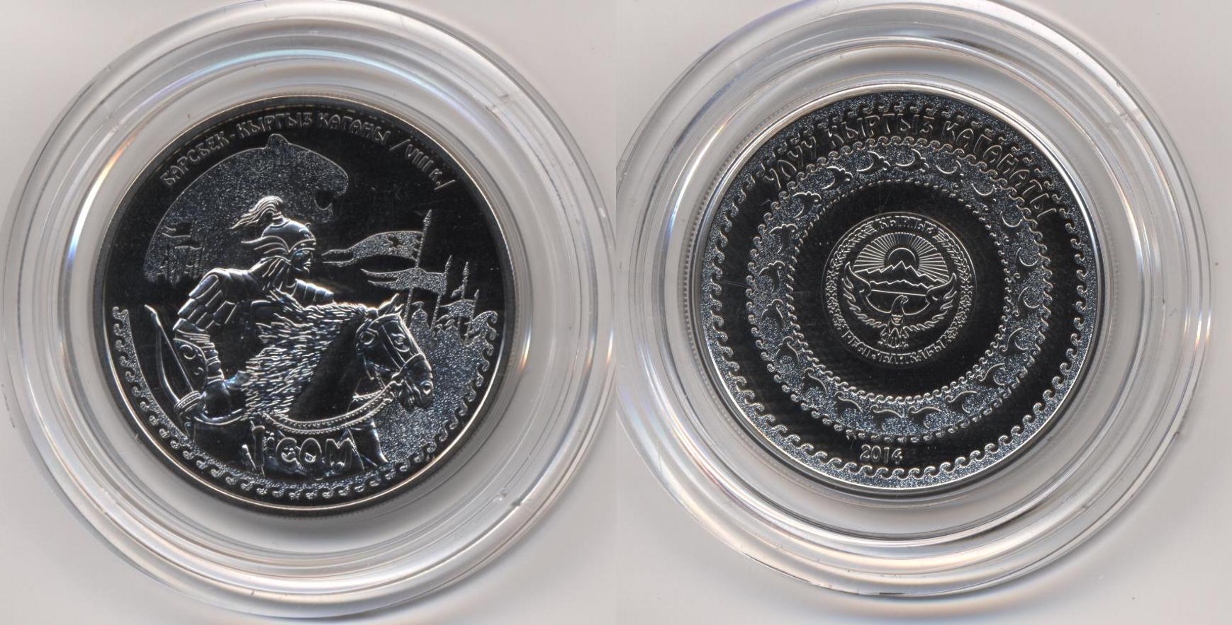 Барсбек - каган кыргызов. основной сюжет монеты "Барсбек - каган кыргызов" - это изображение кыргызского кагана - Барсбека, облаченного в боевые доспехи, верхом на коне и его многочисленное войско. Небо в виде головы барса