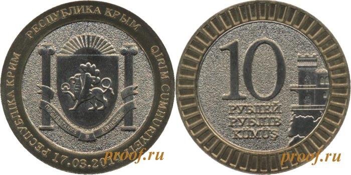 Памятная монета, посвященная провозглашению Независимости Республики Крым 17 марта 2014 год. В отличии 10 рублей из набора М-243 имеет зернистую поверхность поля