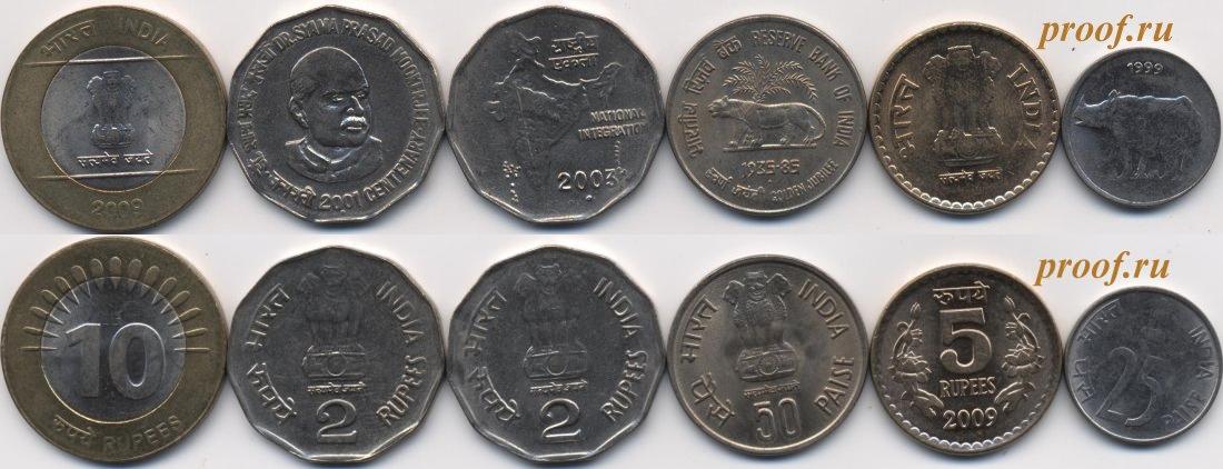 Набор из 6 монет: 25, 50 пайс, 2, 2, 5 и 10 рупий 1985-..