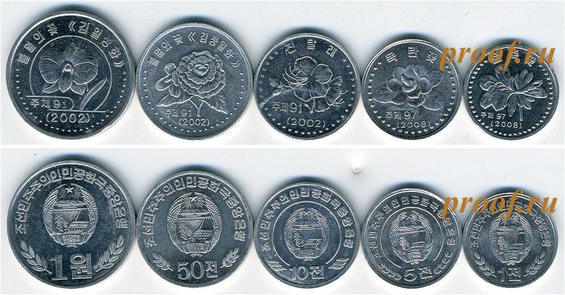Набор из 5 монет: 1, 5, 10, 50 чон и 1 вон. Р-2858