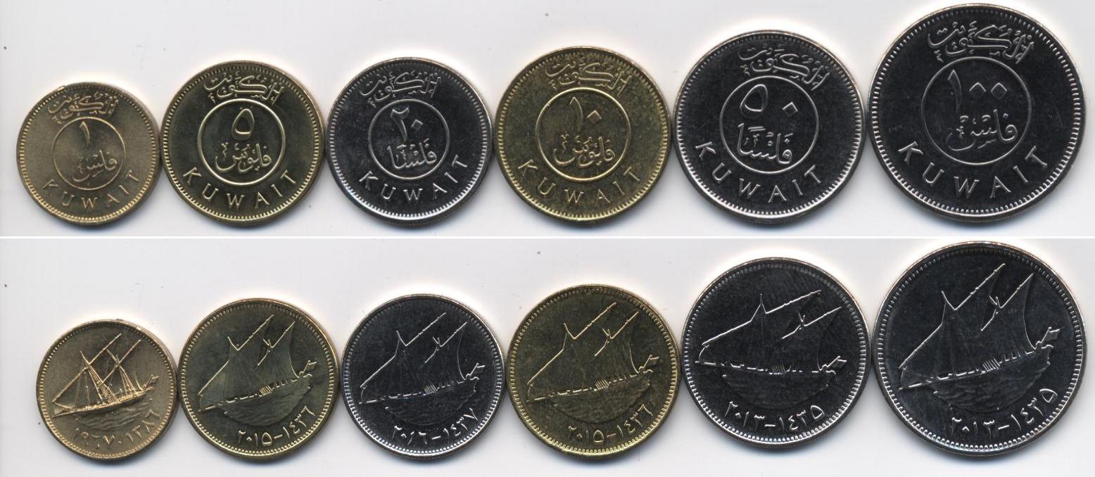 Набор из 6 монет: 1, 5, 10, 20, 50 и 100 филсов. Монеты с изображением парусника.