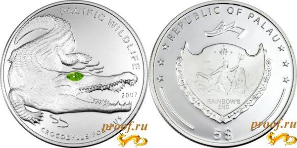 Монета из серии "Тихоокеанская дикая природа". Морской крокодил. Размер крокодила может достигать 5 метров, а возраст 100 лет. Особенностью монеты является глаз крокодила в виде зеленого кристалла Сваровски