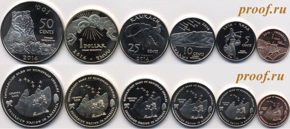 Набор из 6 монет: 1, 5, 10, 25 и 50 центов, 1 доллар. Монеты племени Кумеяй. По американским законам индейцы имеют право чеканить собственные деньги, имеющие хождение внутри резервации