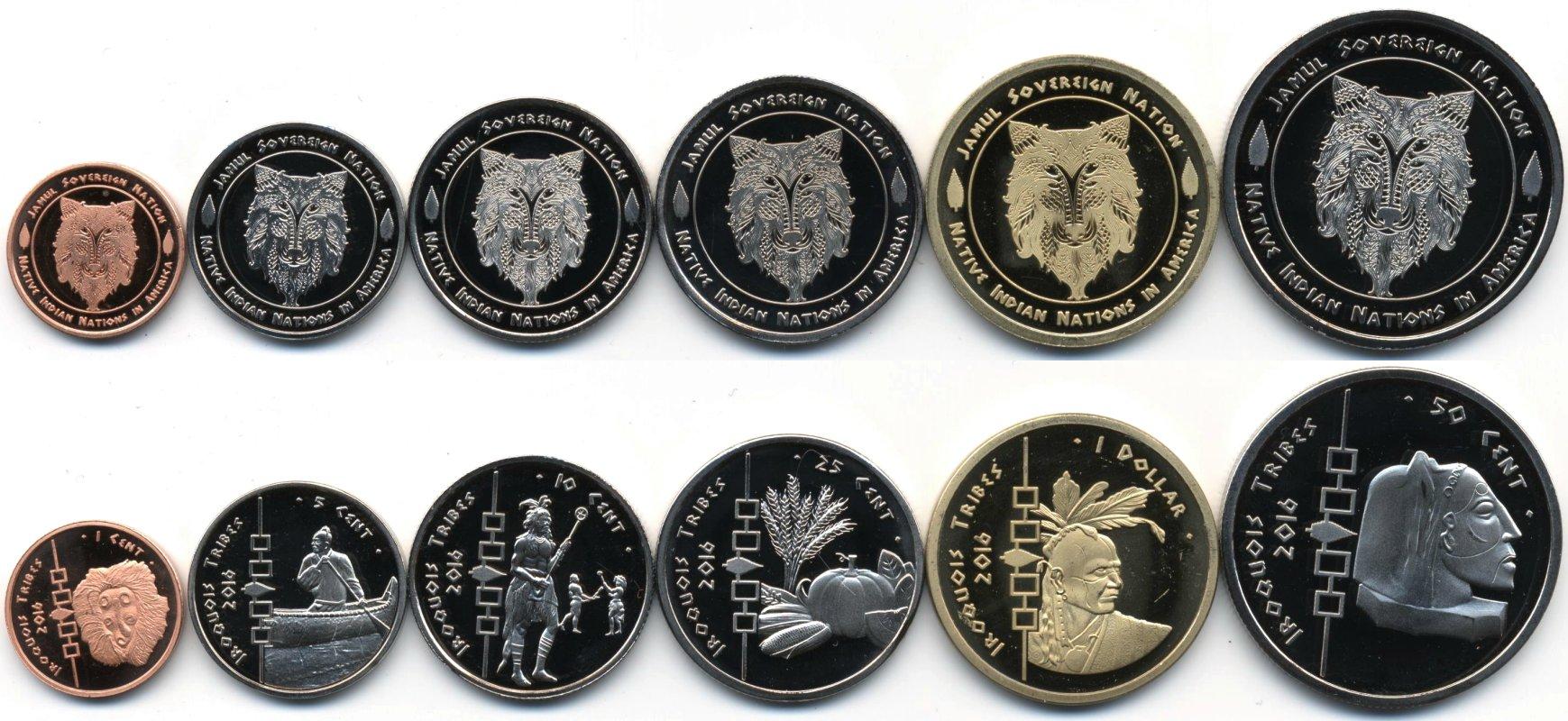 Р-5051 : Набор из 6 монет: 1, 5, 10, 25 и 50 центов, 1 доллар. Монеты племени Могавков. По американским законам индейцы имеют право чеканить собственные деньги, имеющие хождение внутри резервации : МОНЕТЫ : СЕВЕРНАЯ АМЕРИКА : ИНДЕЙСКИЕ РЕЗЕРВАЦИИ