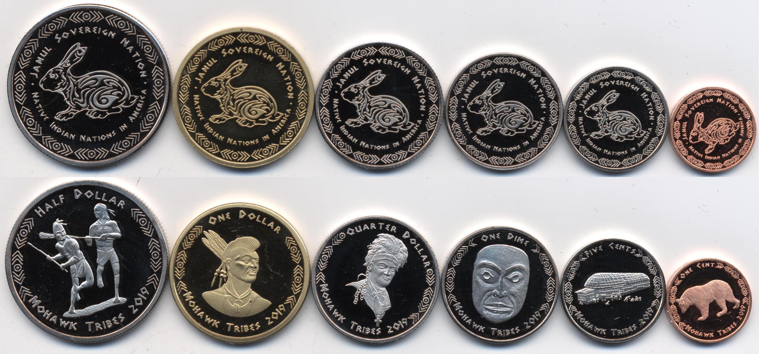 Набор из 6 монет: 1, 5, 10, 25 и 50 центов, 1 доллар. Монеты племени Могавков. По американским законам индейцы имеют право чеканить собственные деньги, имеющие хождение внутри резервации