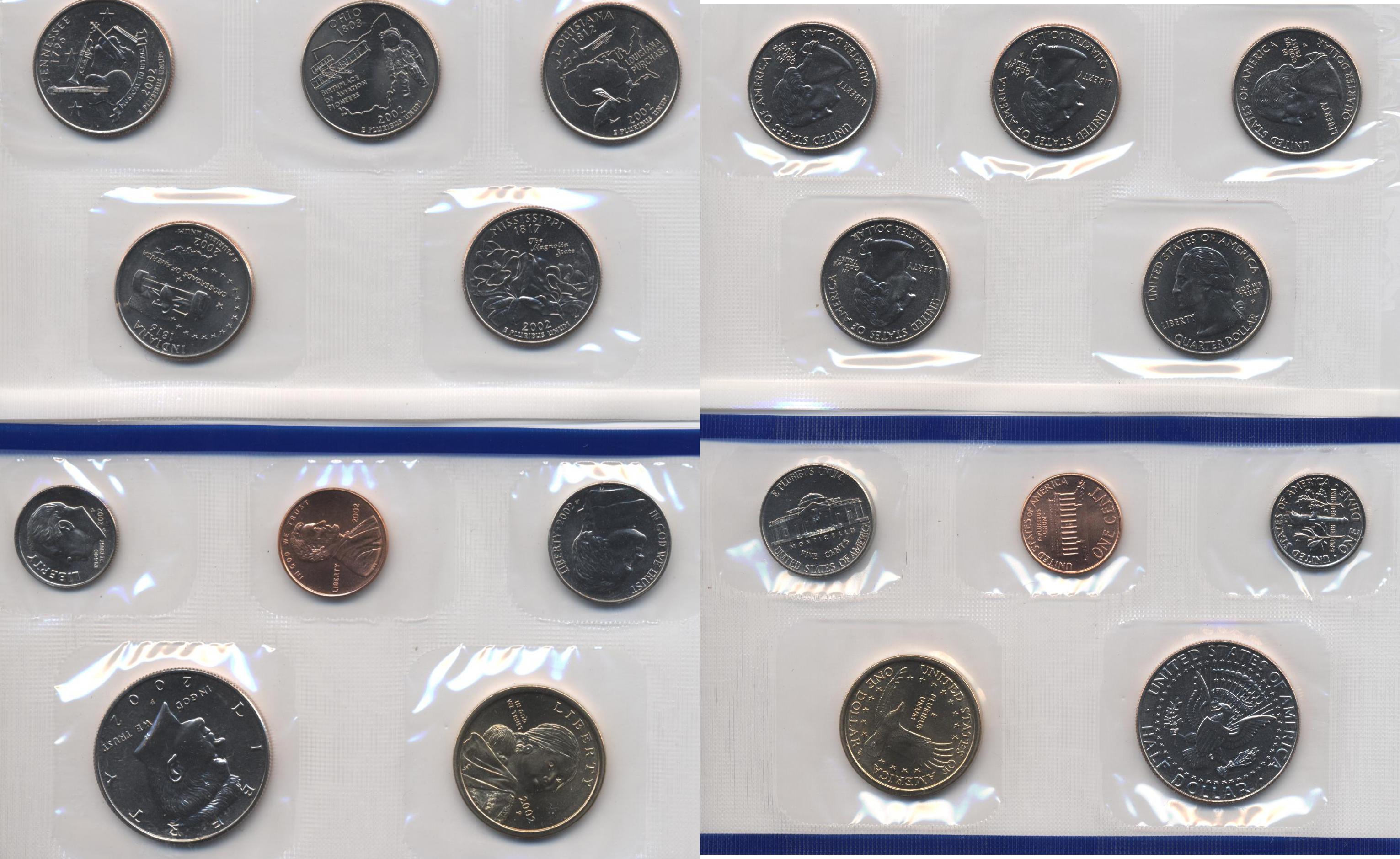 Годовой набор из 20 монет: 1, 5, 50 центов(Кеннеди), 1 дайм и 1 доллар(Сакагавея).+ Штаты 5 монет по 25 центов .(P+D) А/Ц. В блистере