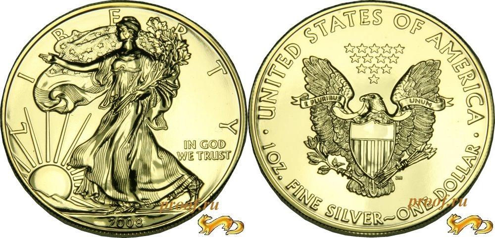 На аверсе - орел, на реверсе - свобода идущая. Состояние - "анциркулейтед". 1 унция (31.1 г) чистого серебра. Позолоченный. Имеется в наличии 2014 год