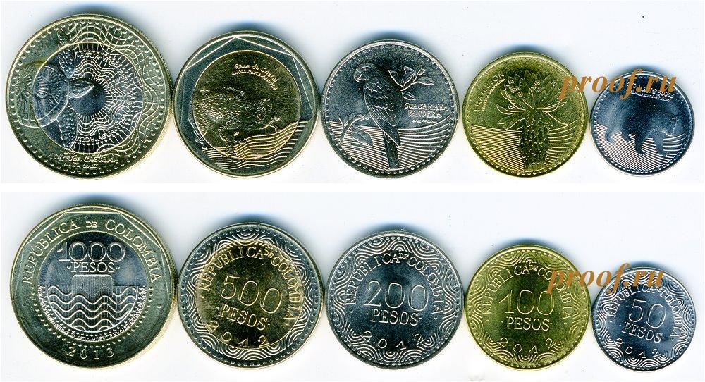 Набор из 5 монет: 50, 100, 200 500 и 1000 песо. Попугай, жаба, черепаха...Р-3335 set