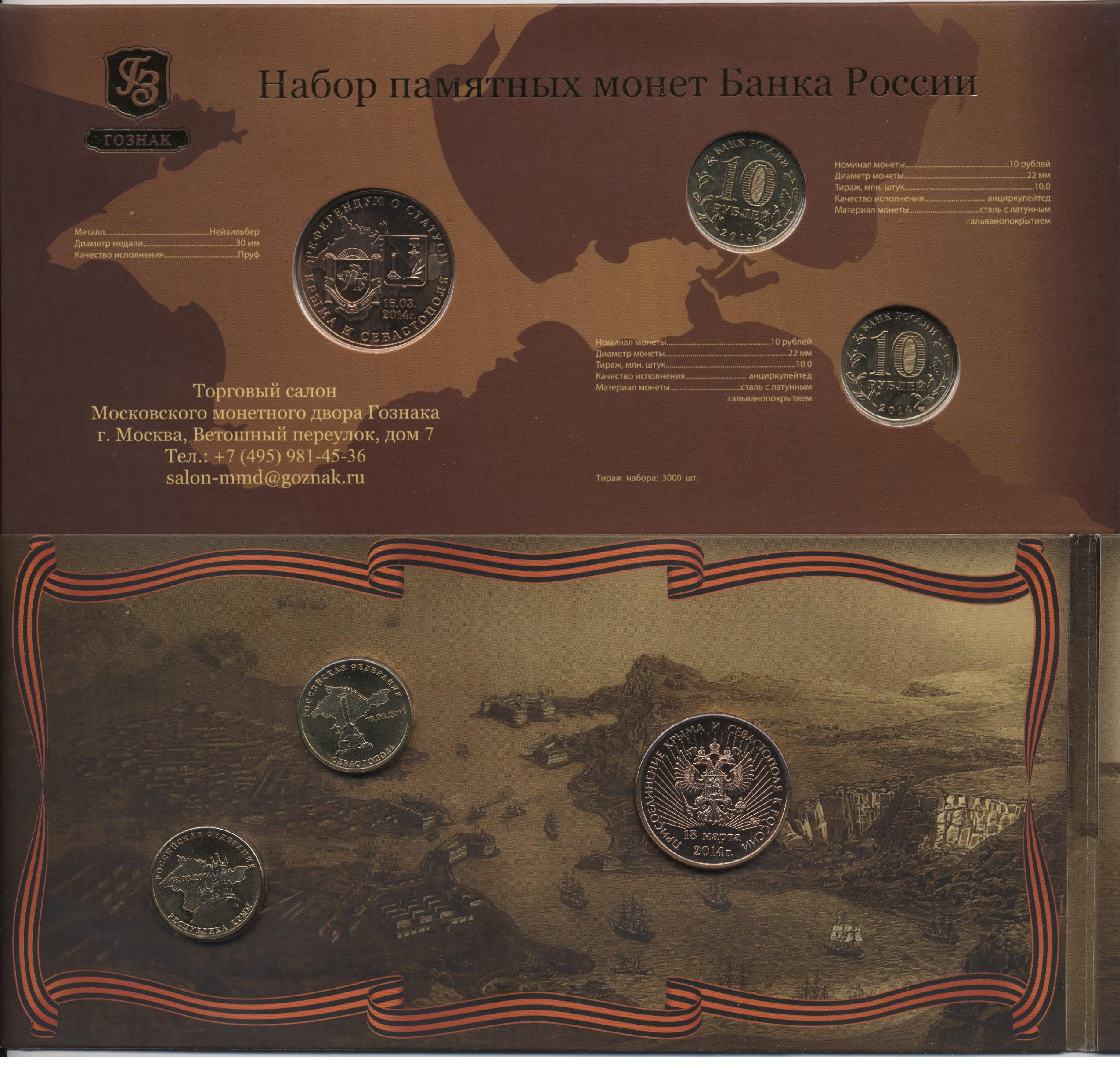 Набор из 2 монет. +Жетон. ПРИСОЕДИНЕНИЕ Крыма и Севастополя к России. Официальный буклет "Гознак". Ошибка( Воссоедиенние Крыма и Севастополя). Ошибочно указан год 1873 вместо 1783(Присоединение Крымского полуострова). Редкий