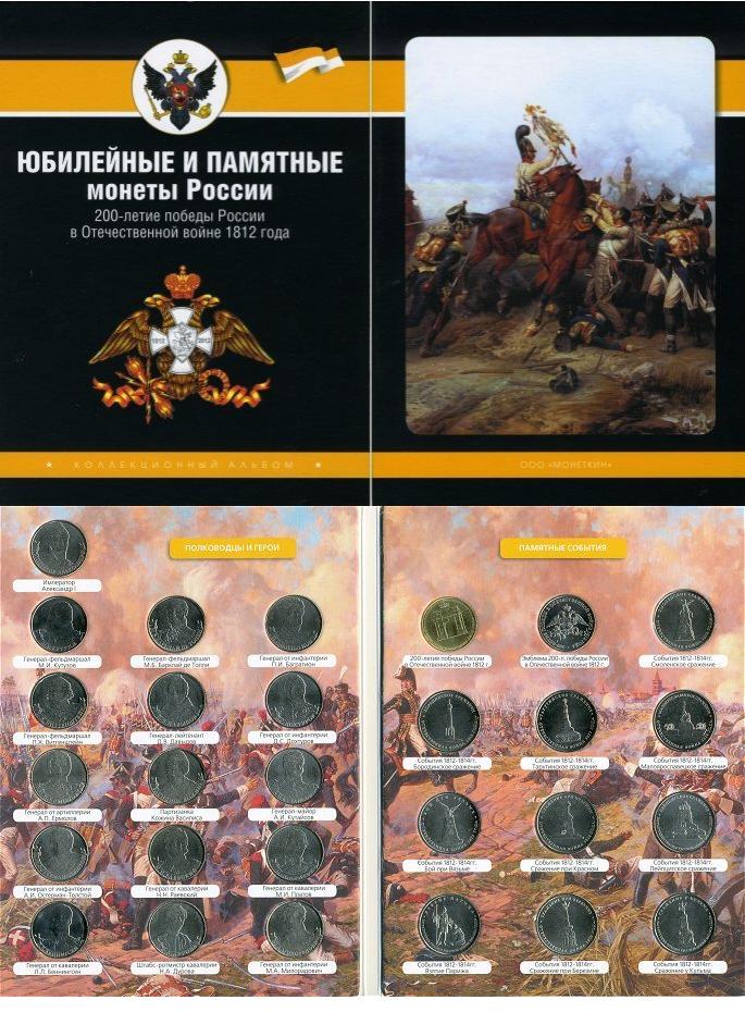 Полный набор из 28 монет в специальном подарочном альбоме.(Ф-44) 200-летие победы России в Отечественной войне 1812 года. Горизонтальное открытие 2 ,5 и 10 рублей