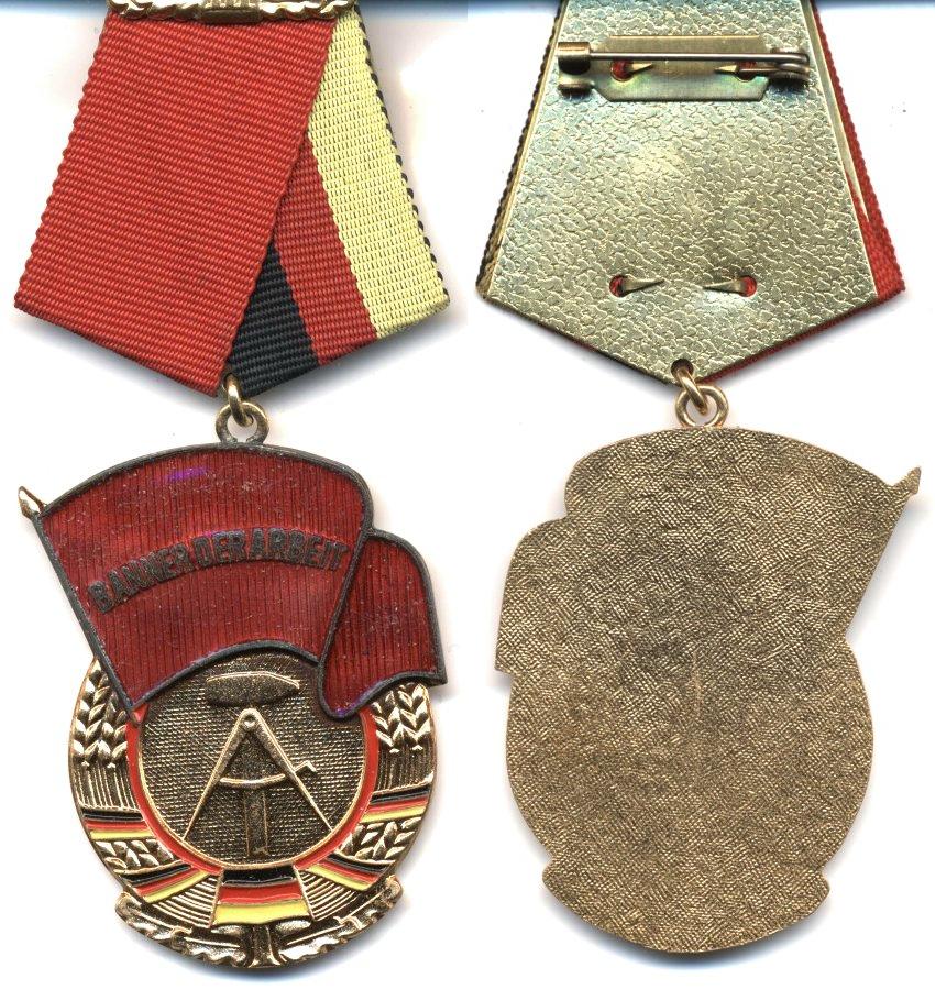 Орден "Трудового красного знамени". 3 степень. Знамя. В центре циркуль в обрамлении венка. Колодка с позолоченой розеткой. Эмаль, позолота.