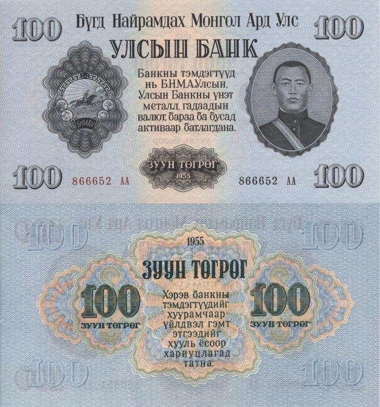 Портрет Д. Сухэ-Батора. Герб. Социалистический стиль банкноты