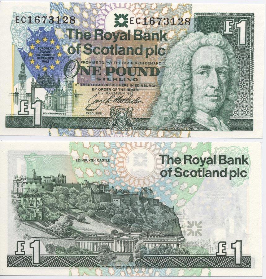 Банк эмитент The Royal Bank of Scotland. Лорд Илей. Эдинбургский замок. Европейский саммит в Эдинбурге, декабрь 1992г. Основной цвет зеленый