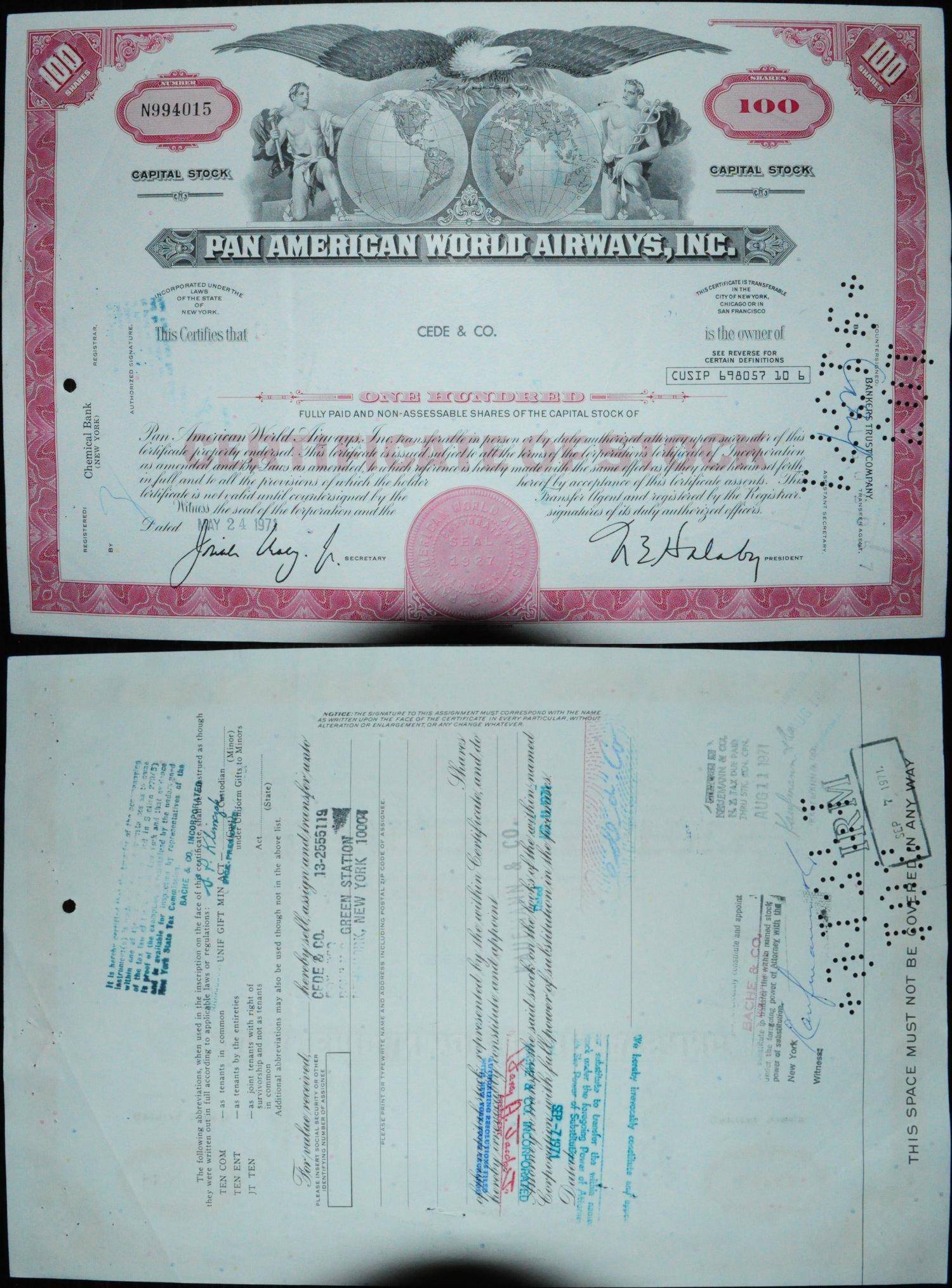 100 акций "Pan American World Airways, Inc." 1960-1971