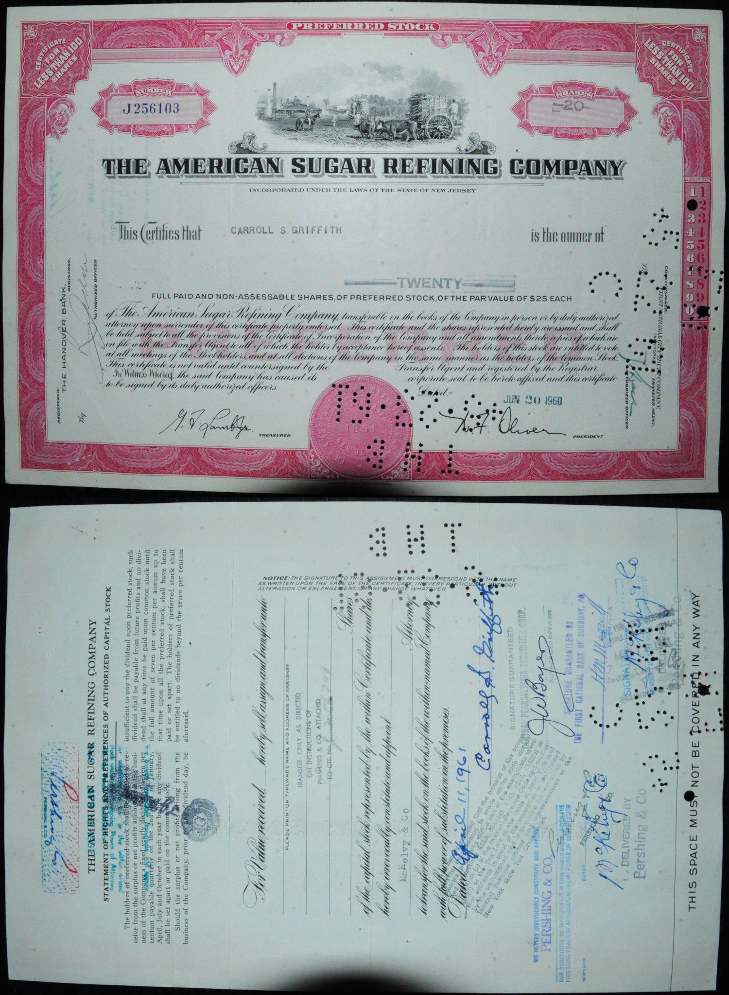 Сертификат на разные суммы акций "The American Sugar Refining Company"