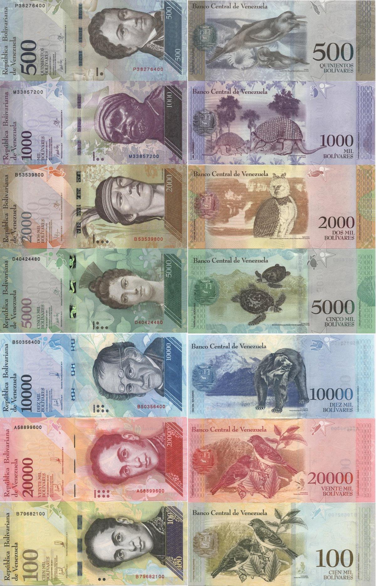 Набор из 7 банкнот: 500, 1000, 2000, 5000, 10000, 20000 и 100000 боливаров