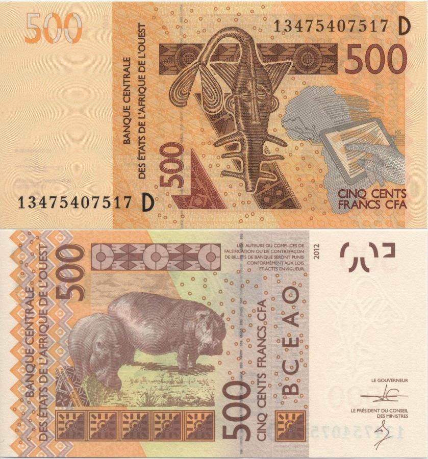 Местный идол. Бегемоты. Банкноты Западноафриканского валютного союза с буквой "D", означающей Мали