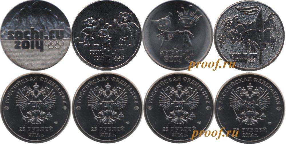 Набор из 4 монет. Олимпиада. Сочи-2014. Горы. Талисманы. Пара - талисманы. Олимпийский огонь