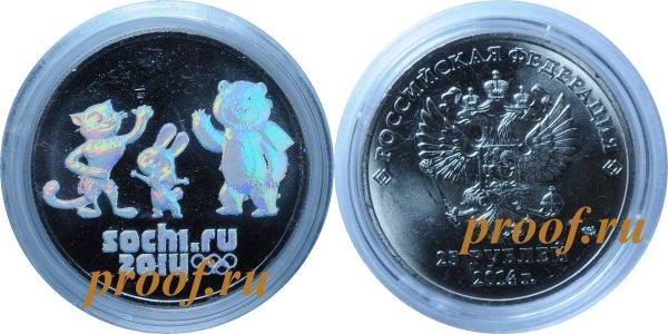 Олимпиада - Сочи-2014г. Талисманы. Монета с цветной голограммой.