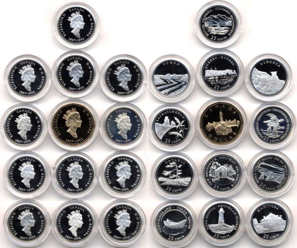 Набор из 13 монет по 25 центов(Ag925 /6г)+1доллар(никель покрыт бронзой с помощью электролиза). 125 лет Канаде. Провитнции. В подарочной коробке с сертификатами