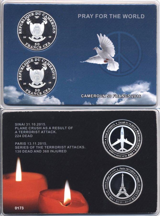 Набор из 2 монет. Монеты посвящены памяти жертв двух печальных событий: авиакатастрофы 31 октября 2015 года аэробуса А321 и терактам в Париже 13 ноября 2015 года. Тираж 2000 штук SALE