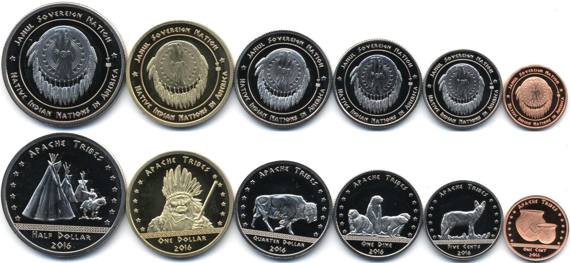 Набор из 6 монет: 1, 5, 10, 25 и 50 центов, 1 доллар. Монеты племени Апачи. По американским законам индейцы имеют право чеканить собственные деньги, имеющие хождение внутри резервации