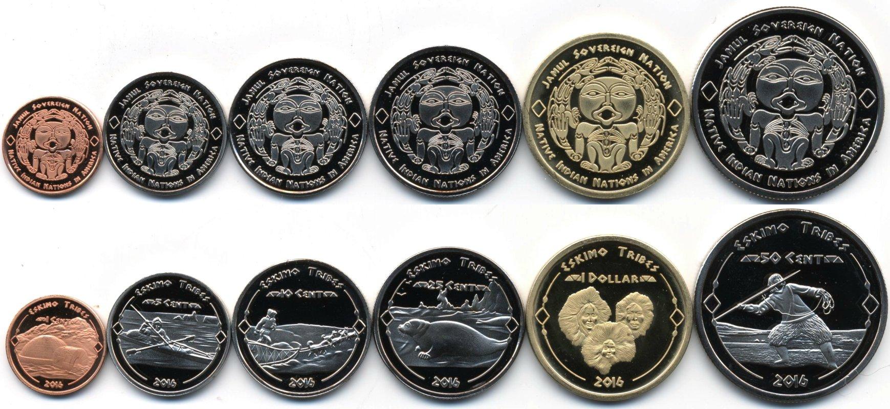 Набор из 6 монет: 1, 5, 10, 25 и 50 центов, 1 доллар. Монеты индейцев Эскимосов. По американским законам индейцы имеют право чеканить собственные деньги, имеющие хождение внутри резервации
