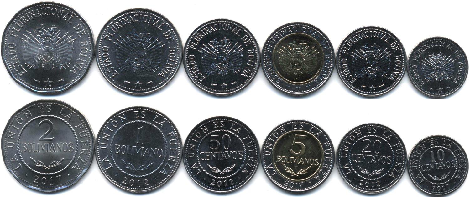 Набор из 6 монет: 10, 20, 50 сентаво, 1, 2, 5 боливиано