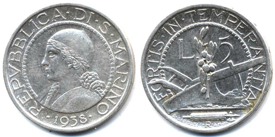 Е-1050 : Плуг. Голова женщины VF-VF+ 1932-1938 : МОНЕТЫ : ЕВРОПА : САН-МАРИНО