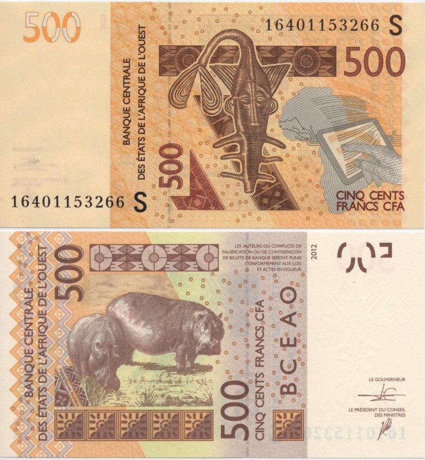 Местный идол. Бегемоты. Банкноты Западноафриканского валютного союза с буквой "S", означающей Гвинею-Бисау