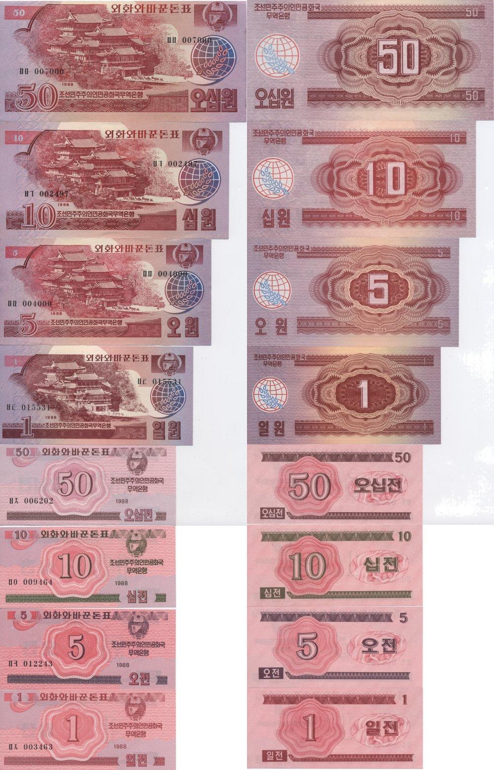 Íàáîð èç 8 áàíêíîò: 1, 5, 10 ,50 ÷îíîâ, 1, 5, 10, 50 âîí. Áàíêíîòû äëÿ "èíîñòðàíöåâ". Âàðèàíò äëÿ ãîñòåé èç äðóæåñòâåííûõ ñòðàí(Socialist Visitor). Äîâîëüíî ðåäêèå