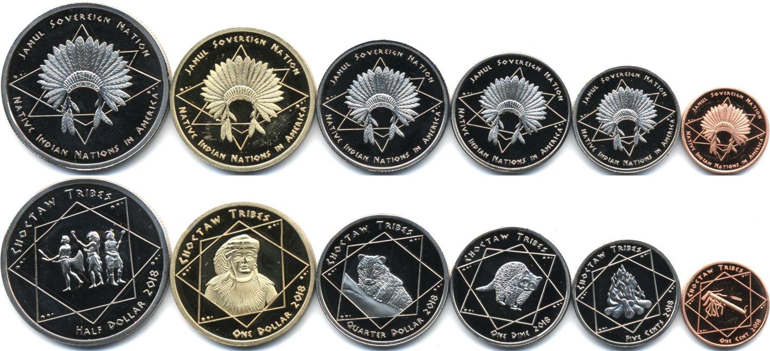 Набор из 6 монет: 1, 5, 10, 25 и 50 центов, 1 доллар. Монеты племени Чоктау. По американским законам индейцы имеют право чеканить собственные деньги, имеющие хождение внутри резервации
