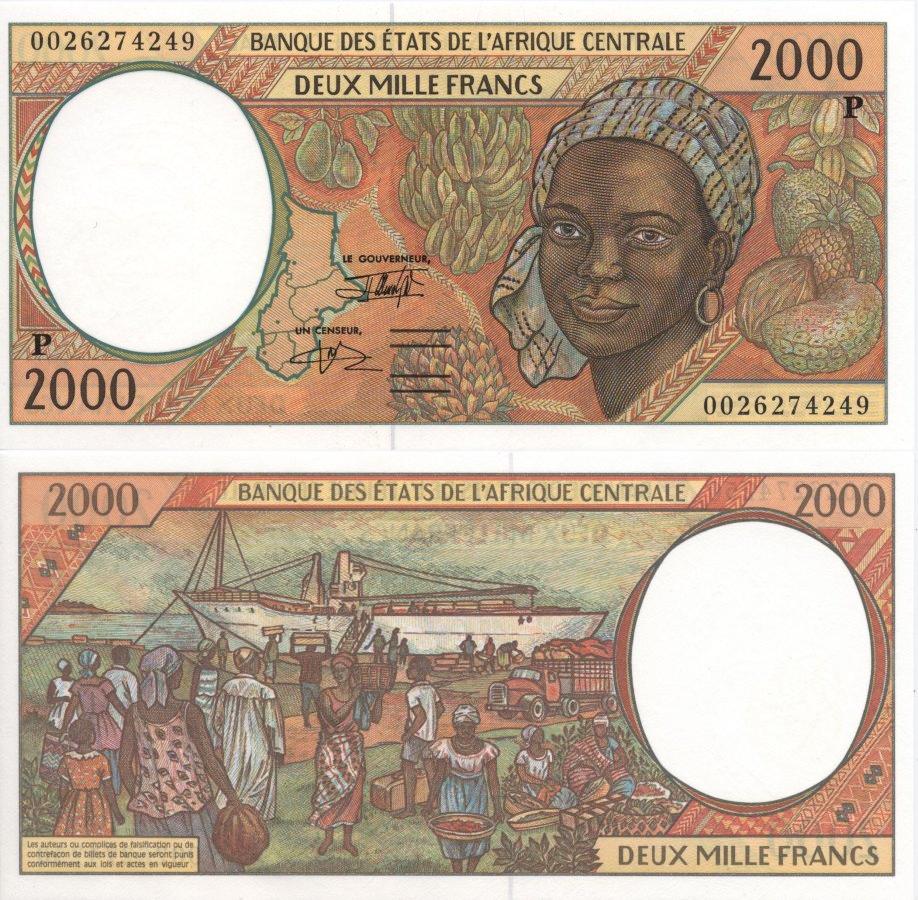 Портрет негритянки. Бананы. Порт. Корабль. Банкноты Центральноафриканского валютного союза с буквой "P", означающей Чад