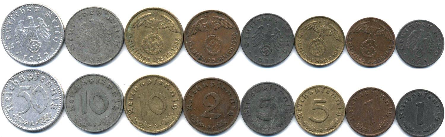 Набор из 8 монет: 1, 1, 2, 5, 5, 10, 10 и 50 рейхспфеннингов с 1936 по 1945 год