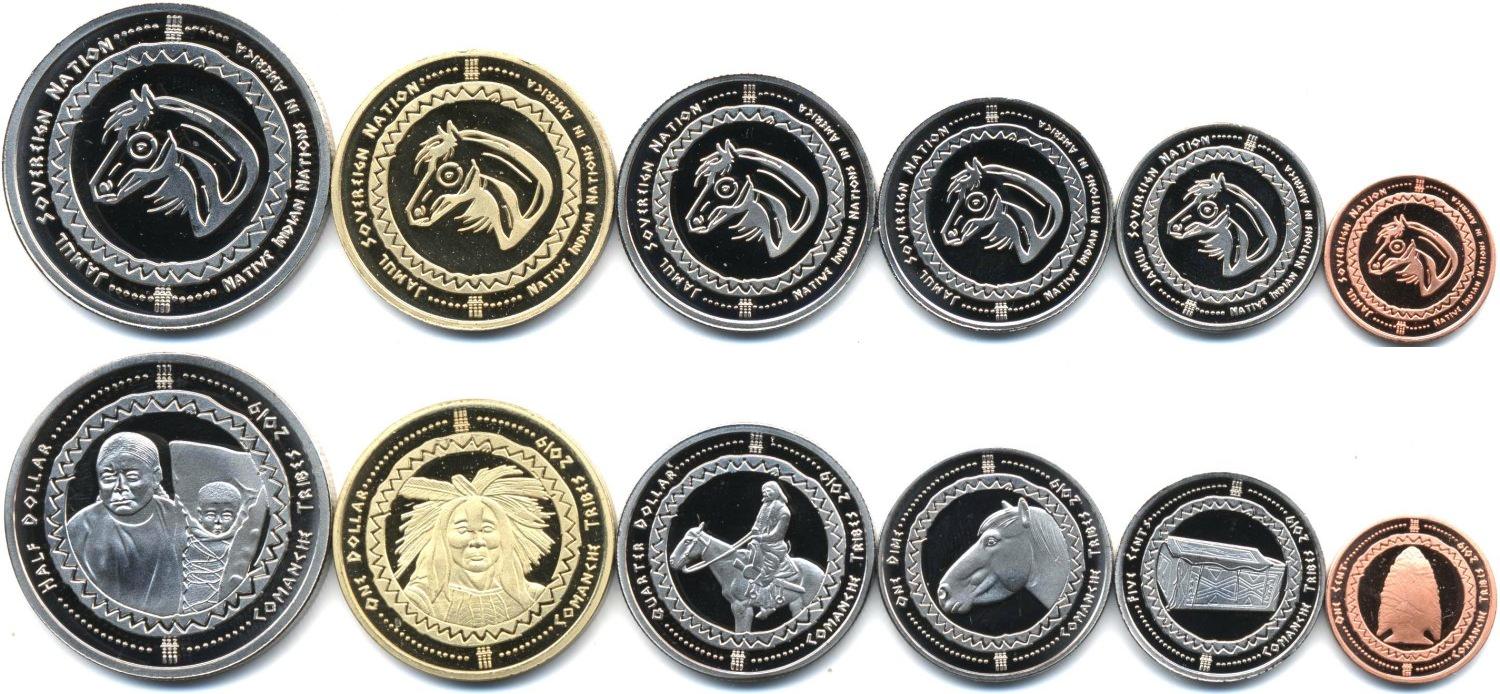 Набор из 6 монет: 1, 5, 10, 25 и 50 центов, 1 доллар. Монеты племени Команчи. По американским законам индейцы имеют право чеканить собственные деньги, имеющие хождение внутри резервации
