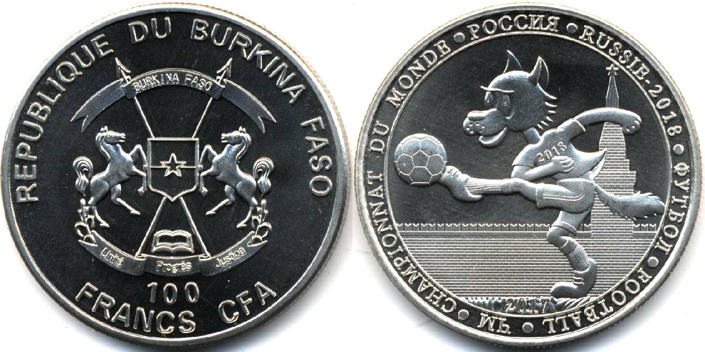 Р-5203 : Первая медно-никелевая монета Буркина Фасо. FIFA-2018 Тип 1 Заводской брак(незначительное "пузырение" металла, микроцарапины, отпечатки пальцев и т.д.)SALE : МОНЕТЫ : АФРИКА : БУРКИНА ФАСО