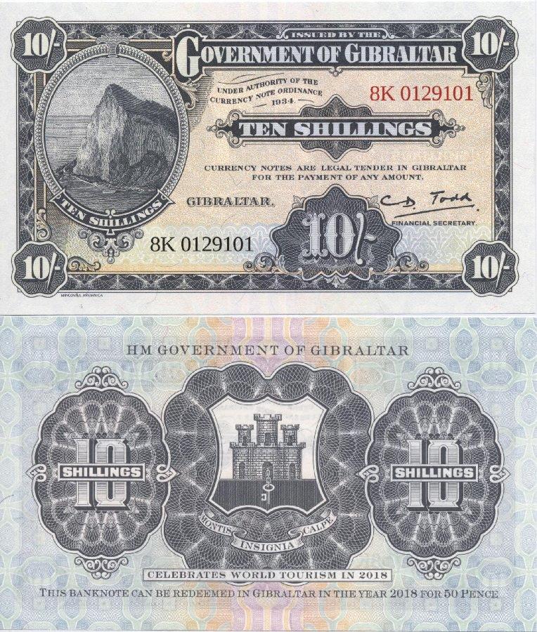 Официальная репродукция банкноты 10 шилингов 1934г., выпущенная правительством Гибралтара в ознаменование Международного года туризма с номиналом 50пенсов. В 2018году могла ходить наравне с остальными официальными платежными средствами