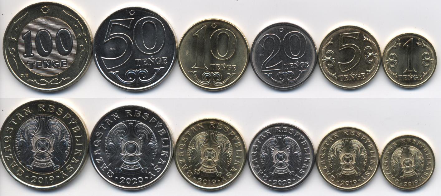 Набор из 6 монет: 1, 5, 10, 20, 50, 100 тенге. Надписи на латинице