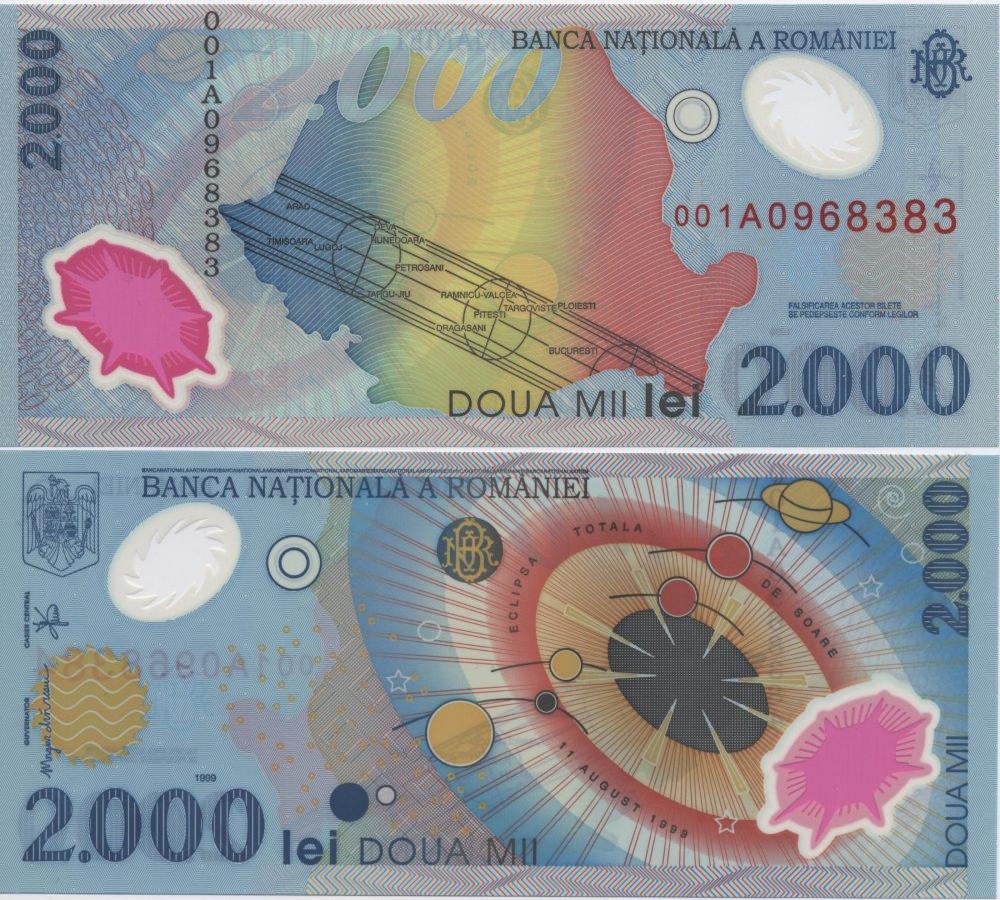 Миллениум и путь полного солнечного затмения по территории Румынии. Солнечная система. Карта Румынии. Многоцветная - основной цвет голубой. Пластиковая банкнота