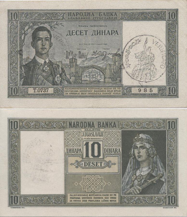 Надпечатка "verificato"на 10 динарах 1939 г. AUNC