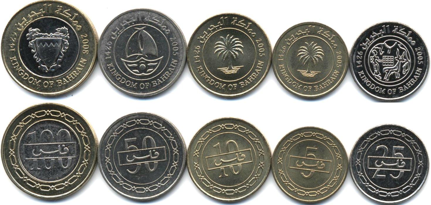 Набор из 5 монет:5, 10, 25, 50 и 100 филсов. Пальма. Стилизованные человек и корова. Стилизованная лодка. Герб. Монета номиналом 100 филсов - биметаллическая. Р-625 set