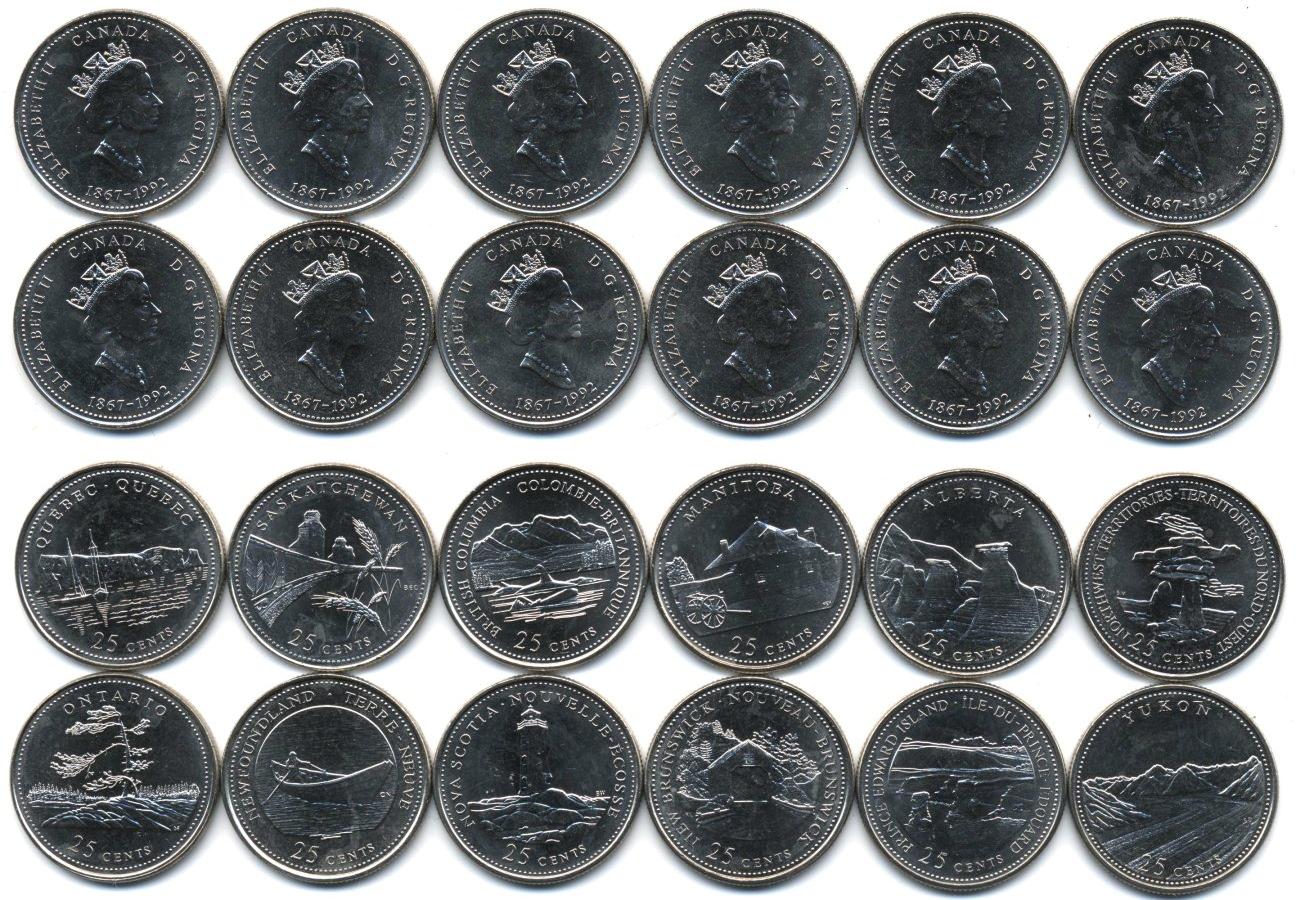 Набор из 12 монет по 25 центов.125 лет Независимости. Провинции и территории Канады. Каждая монета посвящена отдельному штату. Р-629