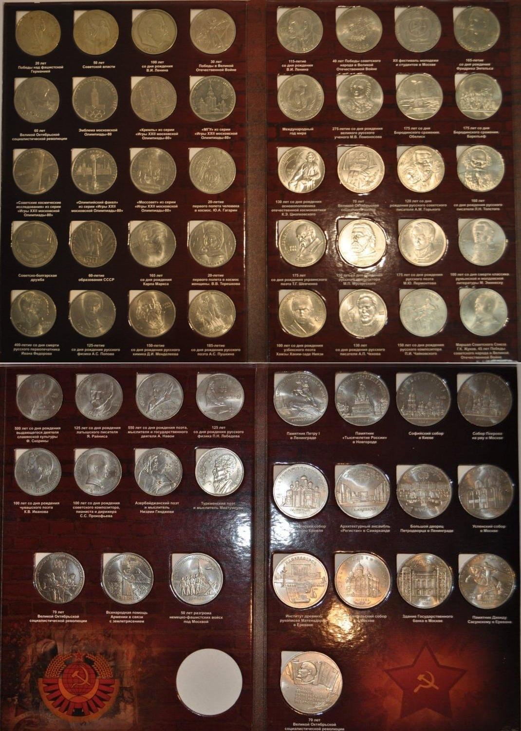 В комплект входят 64 монеты 1, 3 и 5 рублей (от 20 лет Победы до памятника Давиду Сасунскому). В альбоме. Это полный комплект всех памятных медно-никелевых монет выпущенных в СССР 1965-1991